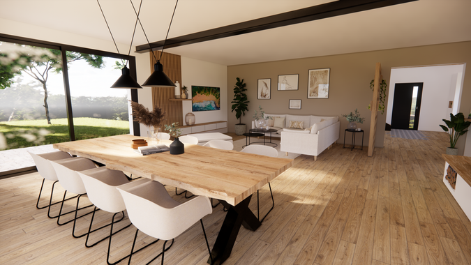 La rénovation complète de cette maison à la campagne a transformé un ancien bâtiment en un lieu de vie moderne et chaleureux, tout en conservant son charme authentique. Chaque détail a été repensé pour créer un espace qui allie confort, fonctionnalité et esthétique, tout en s'intégrant harmonieusement à son environnement naturel. Le rez-de-chaussée a été entièrement ouvert, offrant une pièce de vie lumineuse et spacieuse, idéale pour les moments de convivialité. Le bois est mise en valeur, contrastant avec les matériaux contemporains choisis pour le reste de l’aménagement. Un salon cosy invite à la détente, tandis que la cuisine ouverte semi-ouverte entièrement modernisée, mêle le charme du rustique et les équipements de pointe face à la nature. Les sols en parquet bois massif qui traverse toute la maison, renforçant l’esprit chaleureux et naturel du lieu.